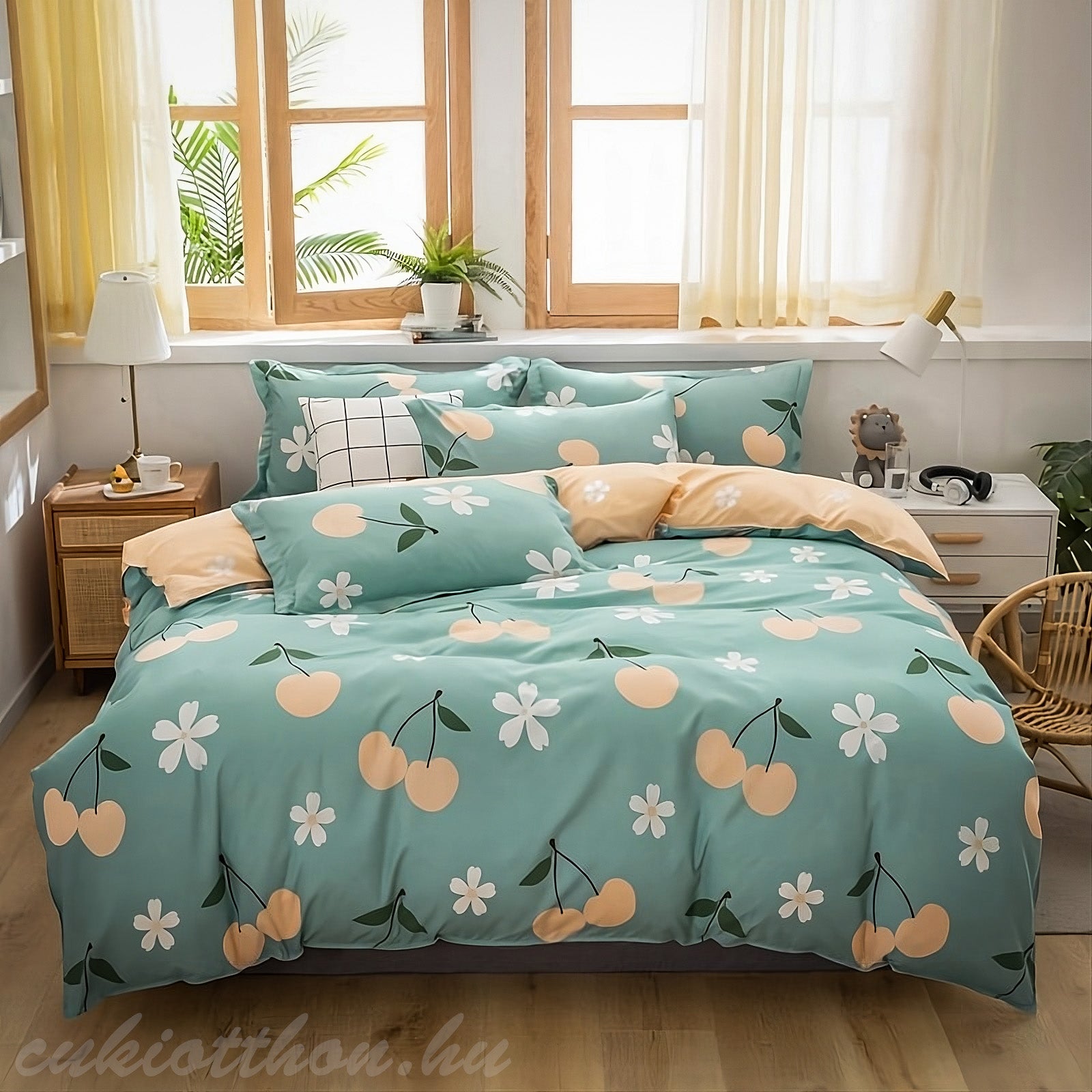 Un set de lenjerie de pat răcoritor și vesel, decorat cu cireșe galben pal și flori albe fermecătoare. Culoarea de bază verde-mentă creează o atmosferă calmă și plăcută în dormitor, în timp ce motivele naturale injectează energie în spațiu. O alegere perfectă pentru lunile de primăvară și vară, pentru a transforma dormitorul într-o mică grădină. 🌸🍒